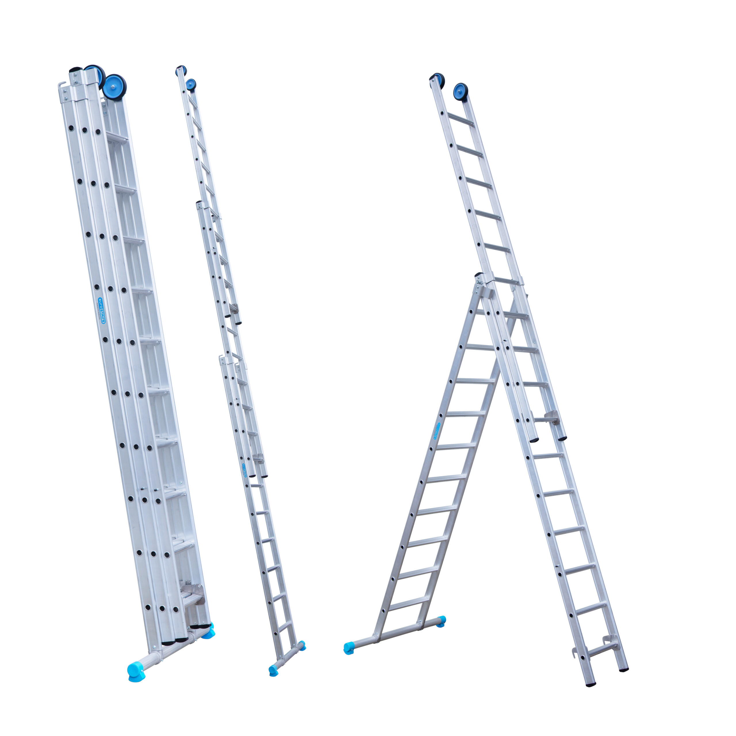 3 Delige rechte reformladder, voor werkzaamheden binnen en buiten op verschillende hoogtes. De ladder kan in de A-stand worden uitgeschoven en hoeft niet tegen een gevel te leunen. De 3-delige ladder van duurzaam aluminium is gemakkelijk te verplaatsen door het lichte gewicht.  De reformladder van Eurostairs is voorzien van extra versterkingspunten en antislipdoppen. Dankzij de stabiliteitsbalk staat de ladder extra stevig. De ladder is goedgekeurd volgens de Europese wetgeving EN131 en geschikt voor professioneel gebruik.
