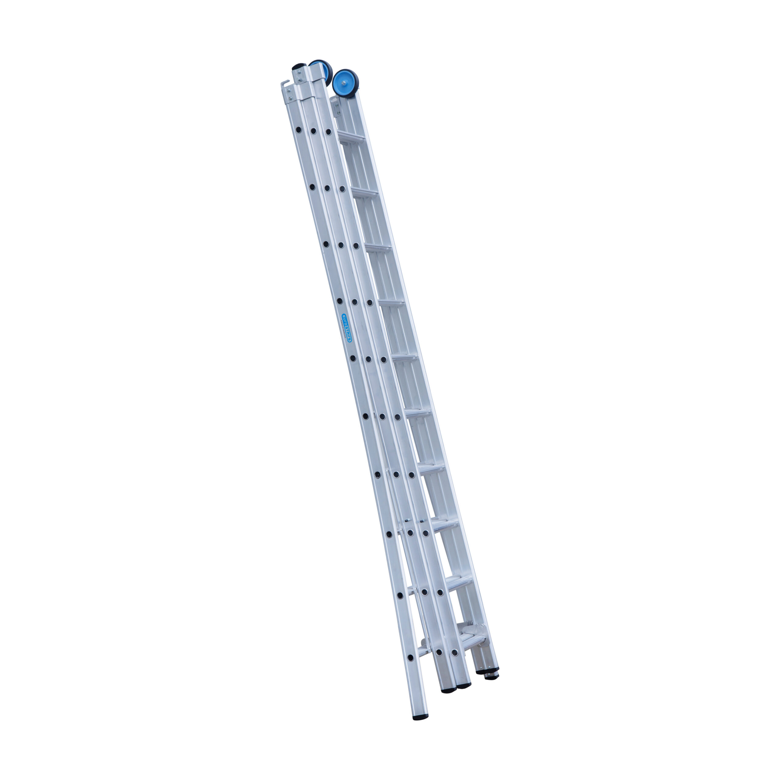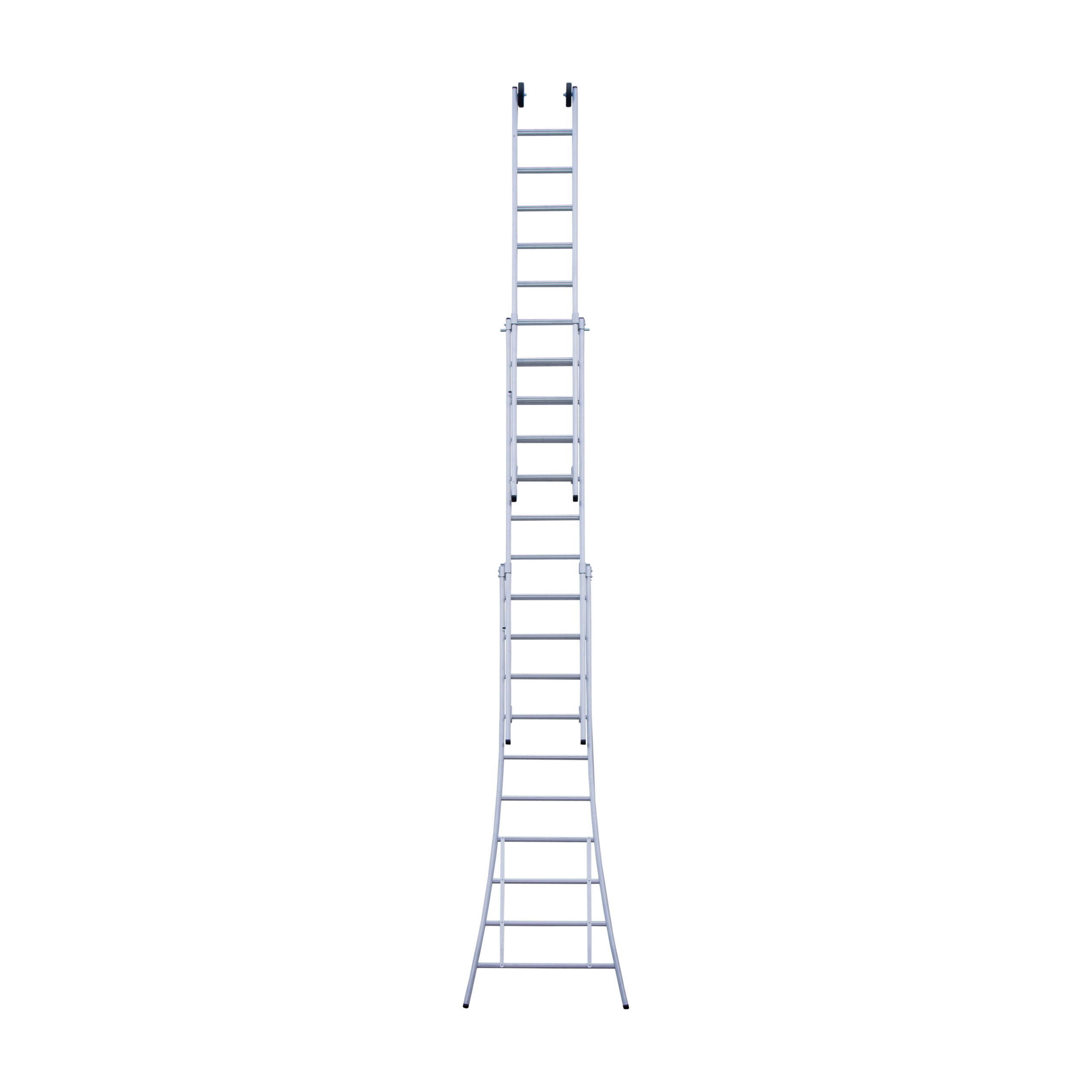 Duurzame driedelige reformladder met treden van 4 cm breed. De ladder kan eenvoudig in A-stand worden uitgeschoven en hoeft niet tegen een gevel of muur te leunen. De aluminium ladder is licht van gewicht, waardoor deze gemakkelijk te hanteren en te verplaatsen is. Voor de veiligheid zijn de reformladders van Eurostairs uitgerust met extra versterkingspunten en antislipdoppen, en daardoor geschikt voor werkzaamheden binnen en buiten. De ladder is goedgekeurd volgens de Europese wetgeving EN131 en te gebruiken door doe-het-zelvers en professionals.